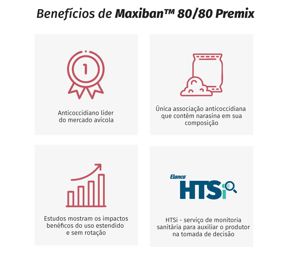 Maxiban™ 80/80 Premix é a associação sinérgica que combina as fortalezas da nicarbazina com a narasina. Estas moléculas afetam o sistema de obtenção de energia e integridade da membrana dos coccídeas, respectivamente; atuando em diferentes estágios do ciclo de vida do parasita. O desenvolvimento da imunidade natural da ave confere um terceiro nível de proteção.1